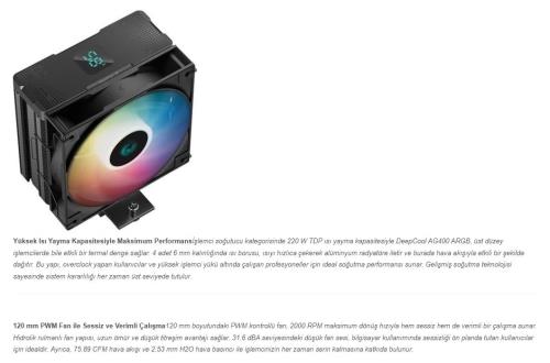 DeepCool AG400 ARGB: Güçlü Soğutma ÇözümüDeepCool AG400 ARGB işlemci soğutucu, masaüstü bilgisayarlar için yüksek performanslı fanlı soğutma teknolojisi sunar. Kullanıcıların overclock ve yoğun işlemci yüklerinde güvenle tercih edebileceği bu model, 220 W TDP değeriyle en zorlu uygulamalarda bile istikrarlı bir termal denge sağlar. Şık ARGB aydınlatması ve kolay montaj özellikleriyle hem görsel hem de işlevsel anlamda öne çıkar.