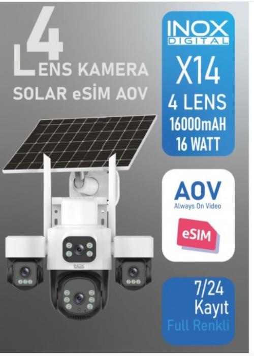INOX-X14 4LENS 3.6mm ESİM SOLAR KAMERA 4G 3+3+3+3MP Ses algılama 20Mt Solar Panel+ Dahili Batarya